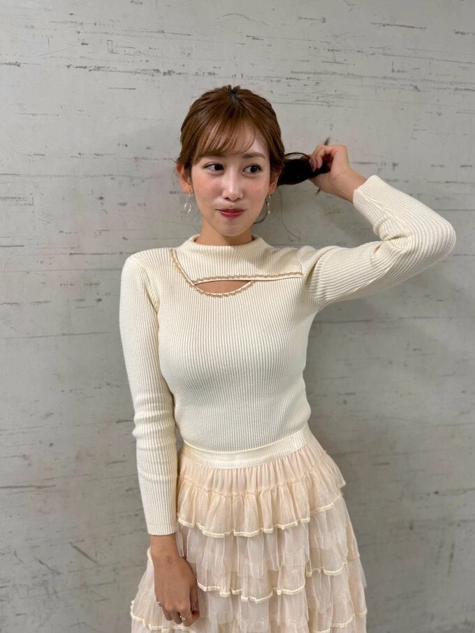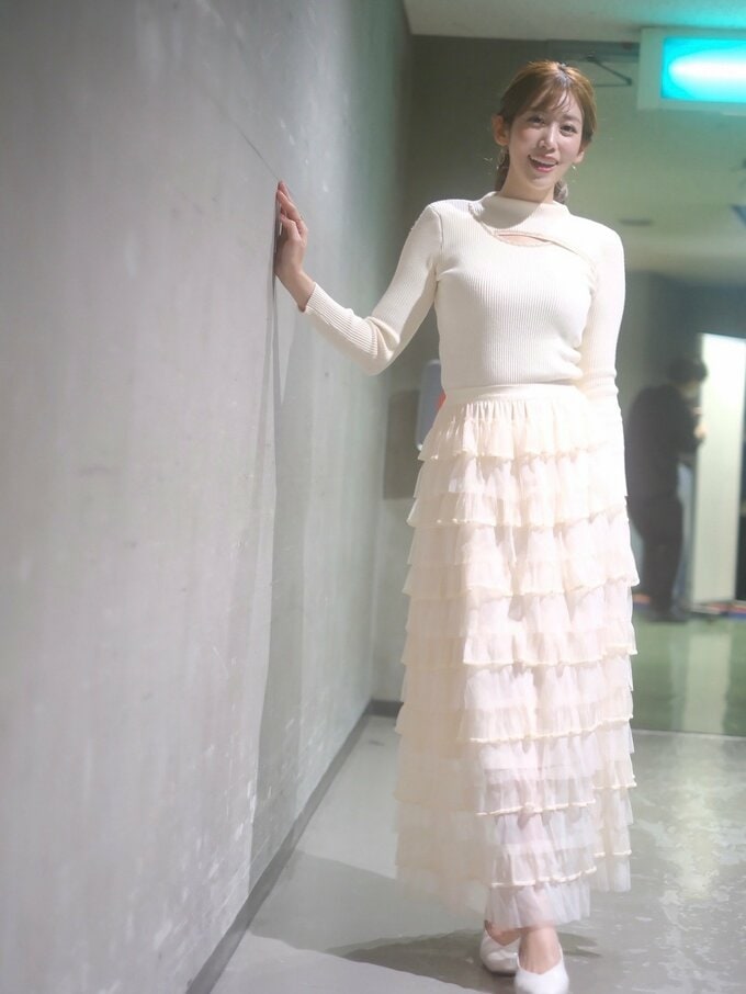 投稿された写真には、全身を白でまとめたニットとフリルスカートのエレガントな衣装姿の中川さんが写っています。
