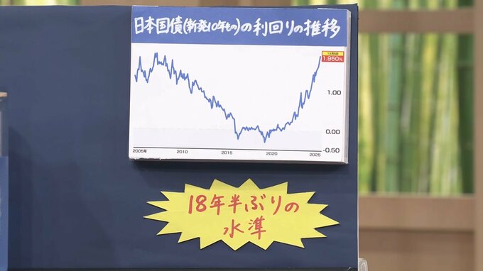 実際、いま国債の価格は下落し続けています。国債は価格が下がると利回りが上がる関係にありますが、12月5日、10年ものの利回りは1.95%と18年半ぶりの水準となりました。