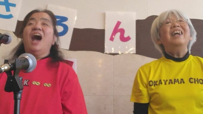 岡山の特産のぶどうの魅力を伝えようと作詞作曲された「瀬戸ジャイアンツ」は、歌詞に「うす皮はじけ さわやかな甘さ」など特徴がもりこまれ、メンバーは、明るい曲調に身体を揺らしながら、客席に歌声を届けました。