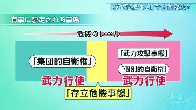 その憲法解釈を変更し、2015年に安保関連法が成立。これにより、「個別的自衛権」に加え、日本が直接攻撃を受けていない場合でも、「集団的自衛権」による武力行使が可能となりました。ただ、行使できる事態については憲法9条に従い、極めて限定した形で規定されたのが「存立危機事態」です。