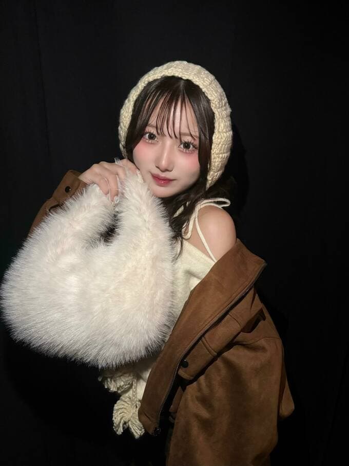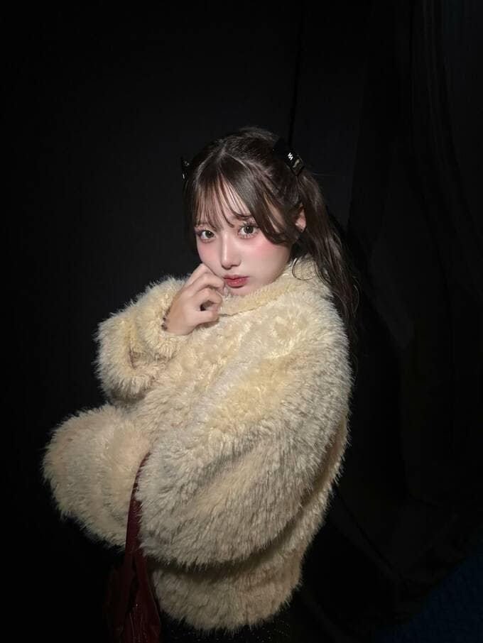 別のカットではクリーム色のふわふわとしたファーコートに身を包み、手を頬に添えたポーズが印象的です。優しく頬を赤く染め、カメラを見つめる表情には、控えめな可愛らしさが漂っています。