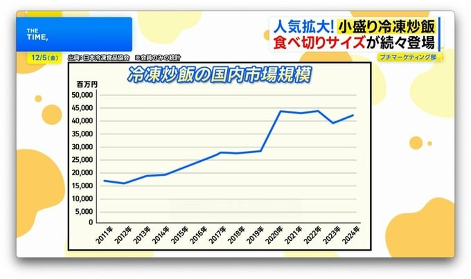 日本冷凍食品協会によると、レンジで簡単調理ができる「冷凍炒飯」の国内市場規模はここ10年ほどで右肩上がり。(※会員のみの統計)