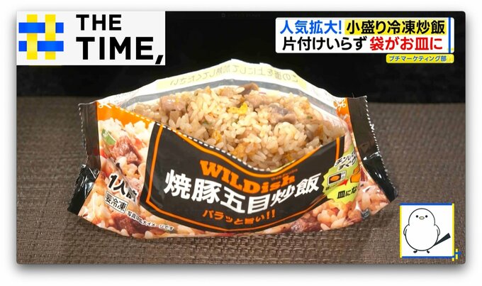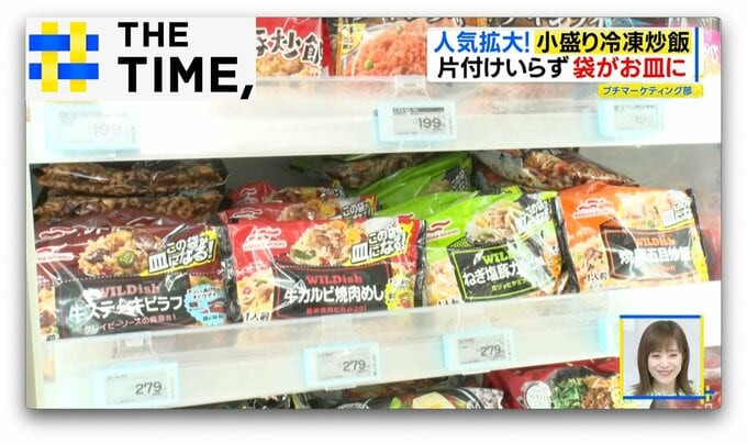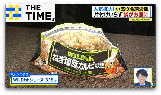 冷凍炒飯などの「WILDishシリーズ」(マルハニチロ/328円※番組調べ)は、袋ごと電子レンジで温める⇒袋をテーブルに立てて置く⇒袋の点線に沿って切ると“皿代わり”に、という商品。