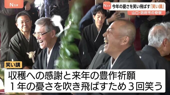 一年の憂さを笑って吹き飛ばす奇祭「笑い講」が山口県防府市でありました。今年の収獲への感謝と来年の豊作祈願、一年の憂さを吹き飛ばすため3回笑います。師走の空におおらかな笑い声が響きました。