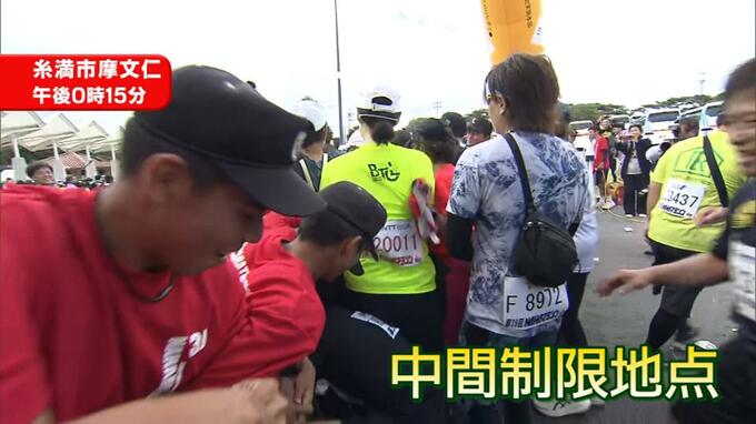 中間制限地点の糸満市摩文仁では午後0時15分、タイムリミットを迎え、人間の鎖がジョガーたちの行く手を阻みました。