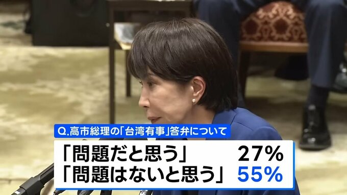 次に、高市総理が国会で台湾有事が集団的自衛権を行使できる「存立危機事態になり得る」と答弁したことについて、▼「問題だと思う」と答えた人は27%、▼「問題はないと思う」は55%でした。