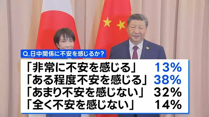 今後の日中関係について不安を感じるかどうか聞いたところ、▼「感じる」と答えた人は「非常に」と「ある程度」をあわせて51%、▼「感じない」は「あまり」と「全く」をあわせて46%でした。