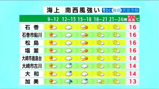 次第にこの後雲が広がってくる見込みで、古川から西のエリアを中心に雨が降るでしょう。海上では南西の風が強く吹きそうです。石巻の最高気温は14℃の予想です。
