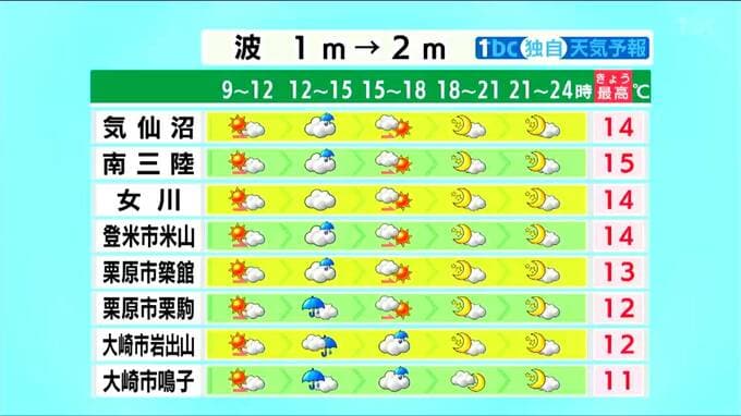 ・登米市米山14℃・栗原市築館13℃・栗原市栗駒12℃