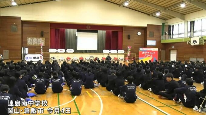 連島南中学校を訪れたのは、アテネパラリンピックの車いす陸上で銅メダルを獲得した永尾嘉章さんです。交流会は日本財団パラスポーツサポートセンターが夢や目標を持つことの大切さを学んでもらおうと全国各地の学校で開催しているもので全校生徒約450人が参加しました。