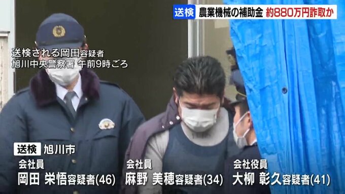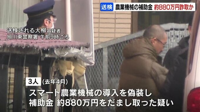 スマート農業に関する国の補助金およそ880万円をだまし取ったとして旭川の男女3人が、8日までに逮捕・送検されました。