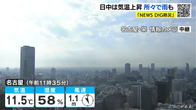正午前の名古屋市内は、雲の広がる時間はあるものの、朝から日差しもよく届いています。この時間の気温は11.5℃で風は穏やかです。