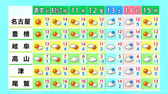最高気温は名古屋や豊橋で16℃、岐阜で15℃、津で17℃くらいになるでしょう。平野部では平年より3℃ほど高くなる見込みです。