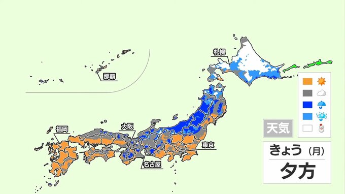 きょうは北陸と東北の日本海側で雨が降り、午後は山沿いや内陸中心に次第に雪に変わる見込みです。北海道も日本海側だけでなく、太平洋側やオホーツク海側で雨が降り、山沿いや内陸では湿った雪になるでしょう。関東から九州では太平洋側で日差しが届きますが、東海は昼すぎから夕方にかけて、通り雨の所がありそうです。