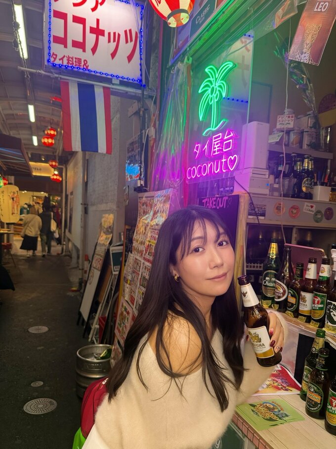 穂川さんは友人と「吉祥寺のハモニカ横丁へ初訪問 レトロ可愛い横丁の中にあるタイ料理のココナツさん」と店を紹介し、店内の賑やかな装飾やタイビール(LEOとSINGHA) を楽しむ様子が収められています。