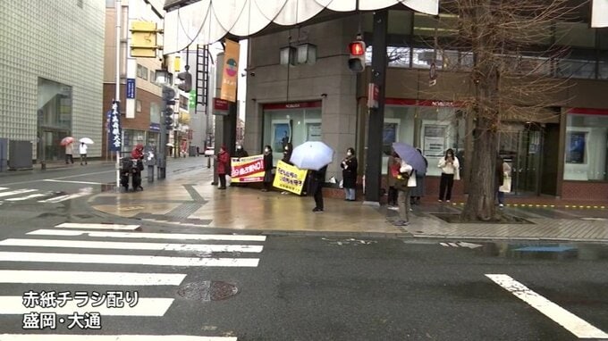 戦争反対を訴える県母親大会連絡会のメンバー28人が参加し、盛岡市の中心部で赤紙が印刷されたビラ200枚を配りました。