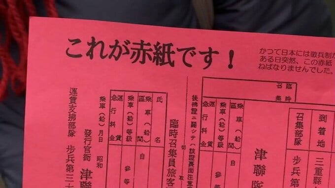 これに合わせて盛岡市では母親たちの団体が召集令状=赤紙が印刷されたビラを配り平和を訴えました。