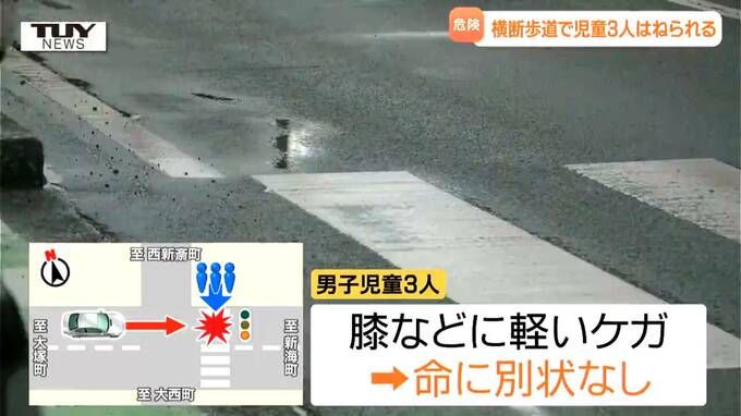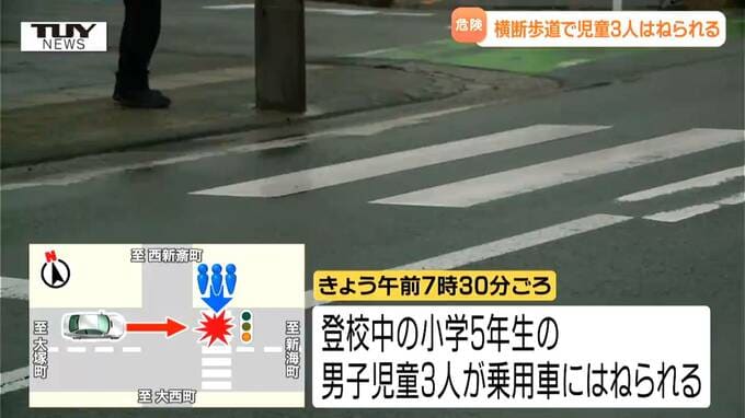 警察によりますときょう午前7時30分ごろ、鶴岡市みどり町の主要地方道鶴岡羽黒線(県道47号)で登校中の小学5年生の男子児童3人が乗用車にはねられました。