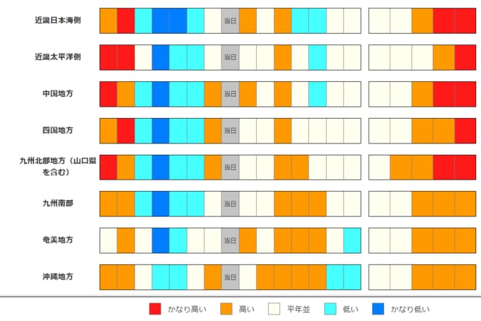 ・2週目の予報は中心の日に前後2日間を加えた5日間の平均(平均気温の5日間平均)です。平均期間は中心の日の下に表示しています。2週目のかなり高い(かなり低い)は、かなり高い(かなり低い)気温となる確率が30%以上のときに表示します。