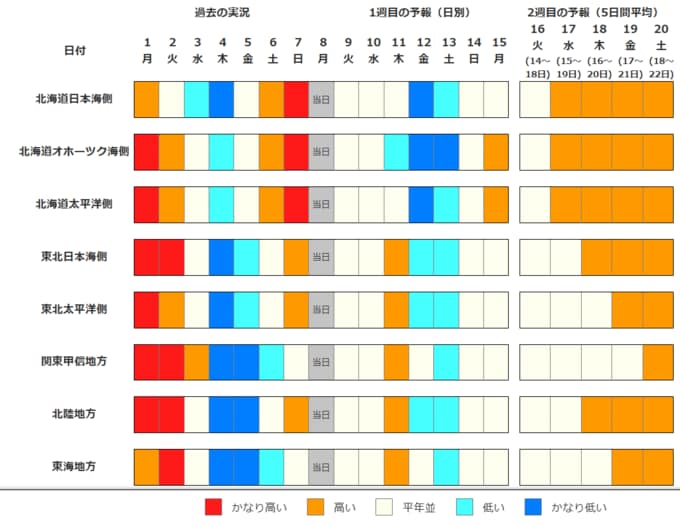 北・東日本の気温は、向こう5日間程度は平年並か低い日が多いですが、その後は平年並か高いでしょう。