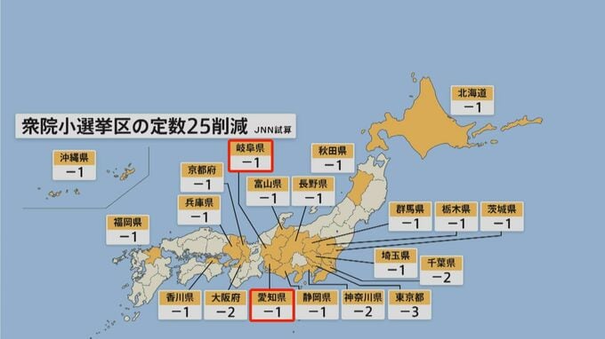JNNが「アダムズ方式」で試算した結果、小選挙区の定数が変わる可能性があるのは20都道府県にのぼり、愛知と岐阜も1減に…。