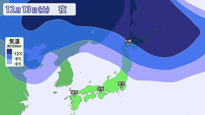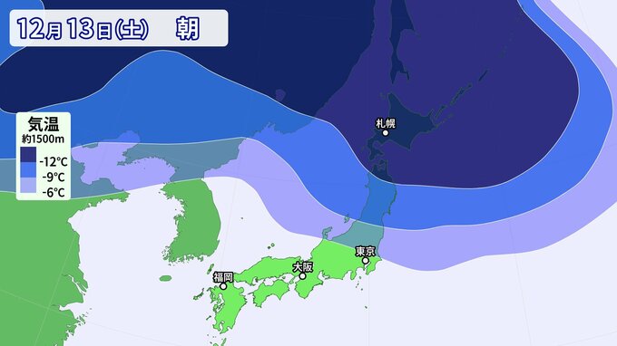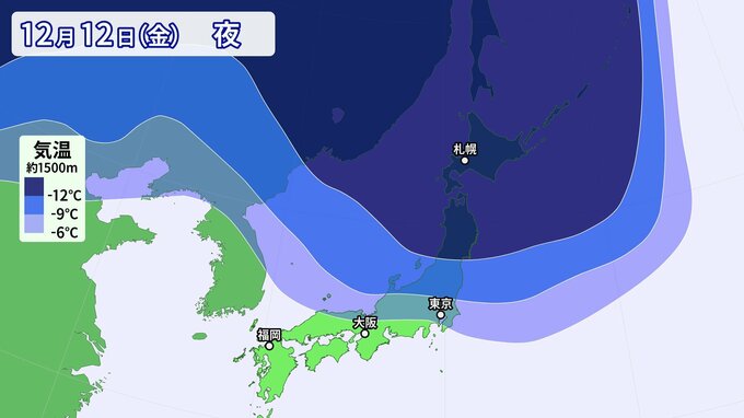 12日(金)~13日(土)頃、日本付近は西高東低の冬型気圧配置となり、北日本を中心に強い寒気が流れ込むでしょう。