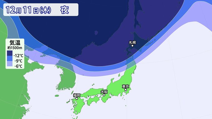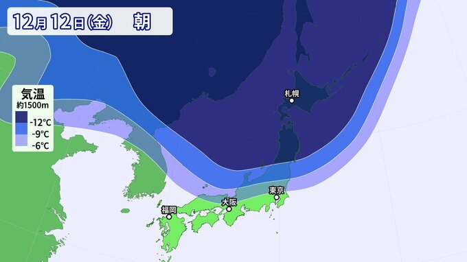 上空約1500メートルでマイナス12℃以下(平地で大雪の目安)の非常に強い寒気が北日本付近へ南下し、マイナス6℃以下(平地で雪の目安)の強い寒気が関東付近まで南下する見込みです。