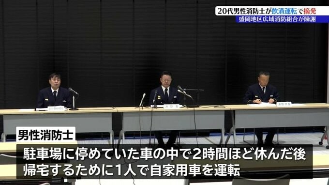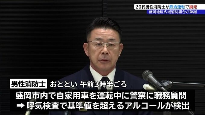 消防組合によりますと、男性消防士は6日午前3時半ごろ、盛岡市内で自家用車を運転中に警察に職務質問され、呼気検査で基準値を超えるアルコールが検出されました。