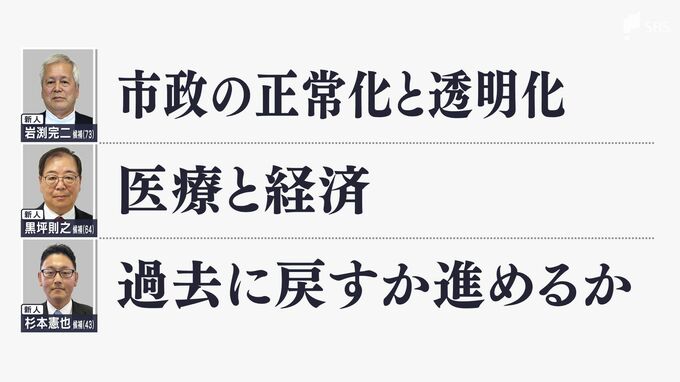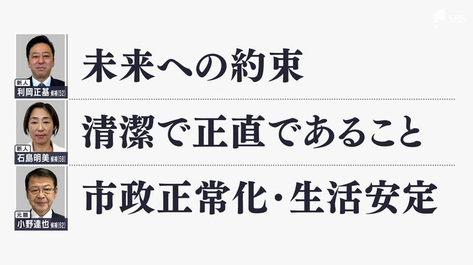 元職の小野達也候補は、「市政正常化・生活安定」とし、半年間で混乱し信頼を失った市政回復が重要なためと答えました。