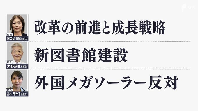 新人の大野恭弘候補は、「新図書館建設」とし、前回の選挙戦でも新図書館の建設計画が争点だったからと答えました。