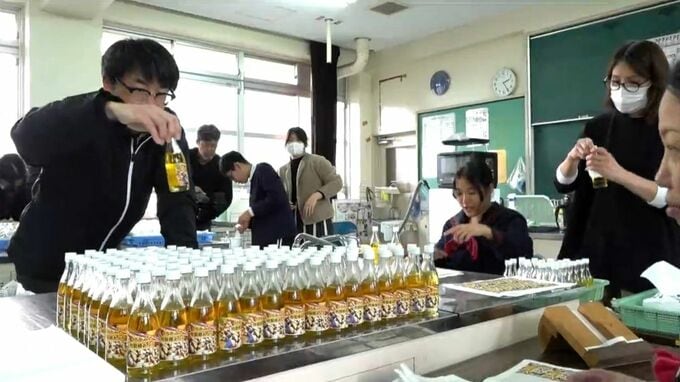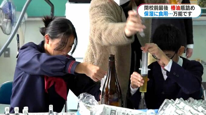 8日は黒神小学校の児童2人も一緒になって、できあがった椿油を100ミリリットルの小びんにつめ、生徒がデザインしたラベルを瓶に貼りました。