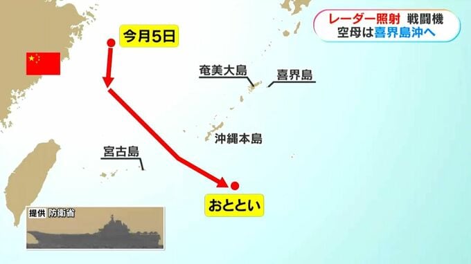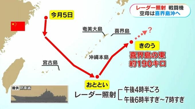 レーダー照射が行われたのは、沖縄本島南東の公海の上空で、6日の午後4時半ごろと、午後6時半すぎから午後7時すぎまでの、あわせて2度でした。