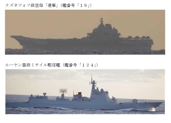 戦闘機を載せた空母「遼寧」は、ミサイル駆逐艦3隻とともに東シナ海から沖縄本島と宮古島の間を航行。