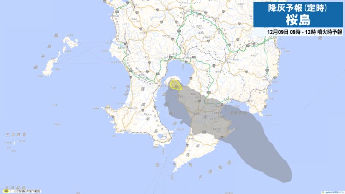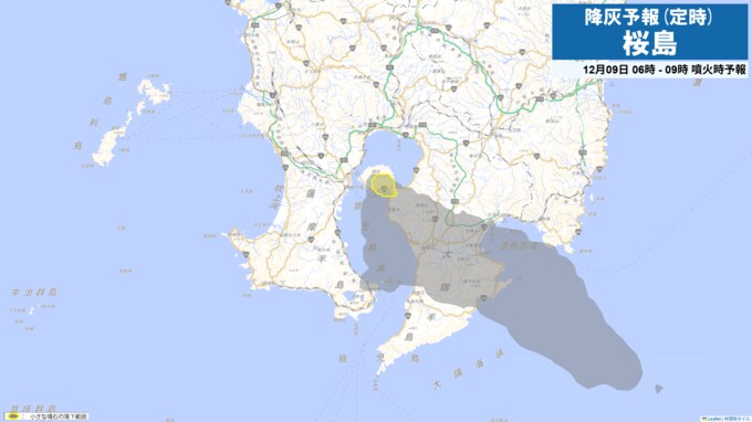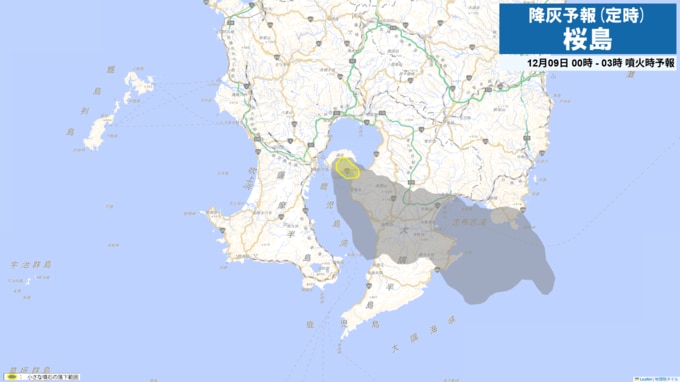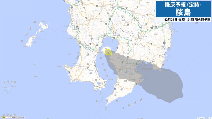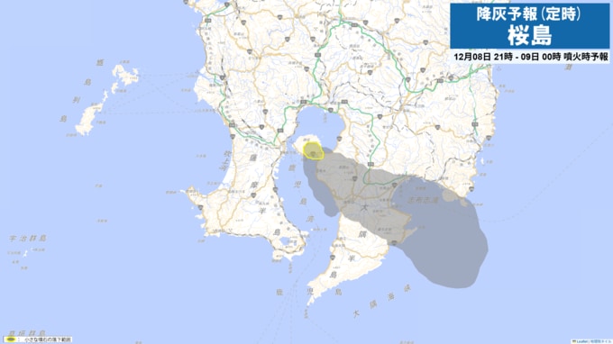 桜島で噴火が発生した場合には、8日21時から24時までは火口から南東方向、9日09時から12時までは火口から南東方向に降灰が予想されます。