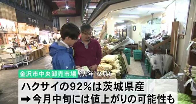 金沢市中央卸売市場に入るハクサイのうち、2024年12月は92%が茨城県産で、雨が降らない影響が長引けば、12月中旬には値上がりの可能性も。