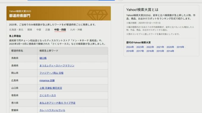 集計期間は2025年1月1日から11月1日までで、去年と比べて検索数が急上昇した人物・商品・作品など5カテゴリー16部門でランキング化しています。