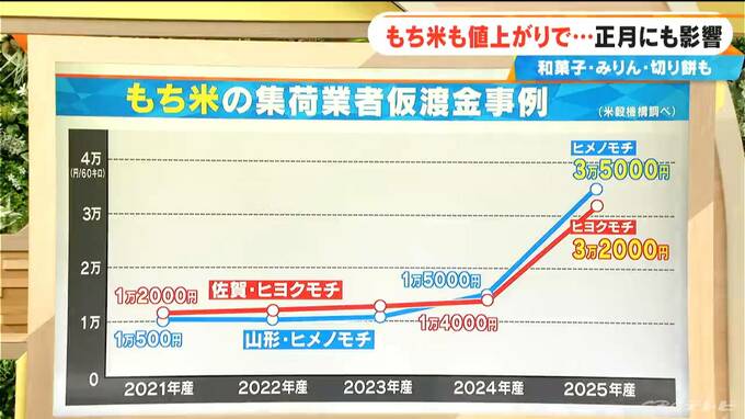 もち米価格の推移を見てみると、2021年から「佐賀・ヒヨクモチ」と「山形・ヒメノモチ」の価格は60キロ1万円台前半~半ばで落ち着いていましたが、去年から今年にかけて跳ね上がり、60キロで3万円台半ばとなりました。