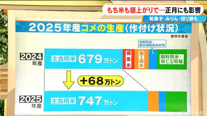 2024年産、主食用のお米が足りなかったので価格が上がりました。その反省も踏まえて増産しようとなり、ことしは68万トン増やしました。ただ、農地には限りがあるので、「主食用米」の割合を増やすと、「飼料用米」と「もち米などの加工用米」の割合(量)が減り、価格が高くなってしまいました。