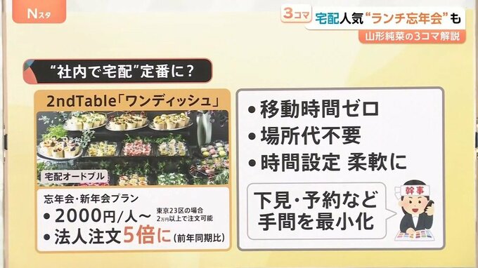 宅配オードブルサービス「ワンディッシュ」の2ndTableでは、1人2000円から注文ができる忘年会・新年会プラン(東京23区の場合。2万円以上で注文可能)を用意していて、2024年の同期比で法人注文が5倍に増えているということです。