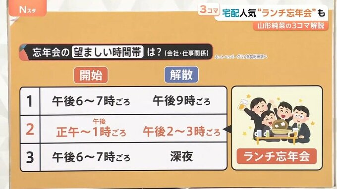 2位には正午~午後1時ごろ開始し、1時間くらいで解散するという“ランチ忘年会”が入りました。