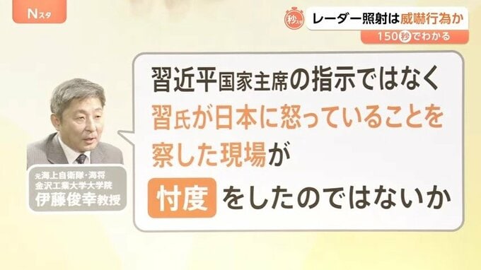 元海上自衛隊・海将で、金沢工業大学大学院の伊藤俊幸教授は、「習近平国家主席の指示ではなく、習氏が日本に怒っていることを察した現場が忖度をしたのではないか」と分析しています。