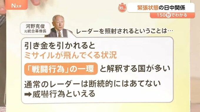 元統合幕僚長の河野克俊さんによると、レーダーを照射されるということは「引き金を引かれるとミサイルが飛んでくる状況。戦闘行為の一環と解釈する国が多い。通常のレーダーは断続的にはあてないため、威嚇行為といえる」ということです。