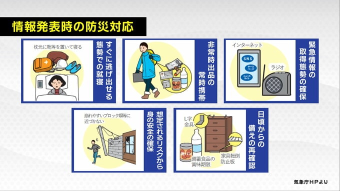 宮城県は、全35市町村が注意情報の対象エリアです。気象庁は主に次のような備えを呼びかけています。