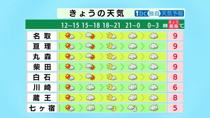 日差しが届く時間帯もありますが、寒気の影響で気温は上がりません。日差しがあっても最高気温は9℃前後にとどまる見込みです。