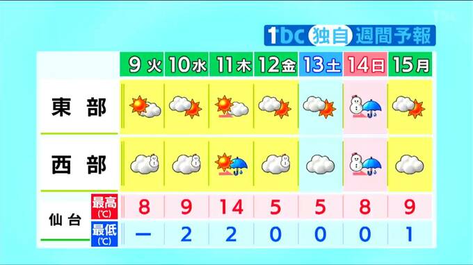週間予報を見ると、東部は比較的晴れ間の出る日が多くなります。一方、西部は寒気や低気圧の影響で雪や雨が降りやすい見込みです。