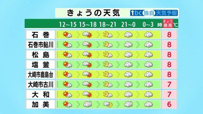 ■塩釜:8℃ ■大崎市鹿島台:8℃ ■大崎市古川:7℃