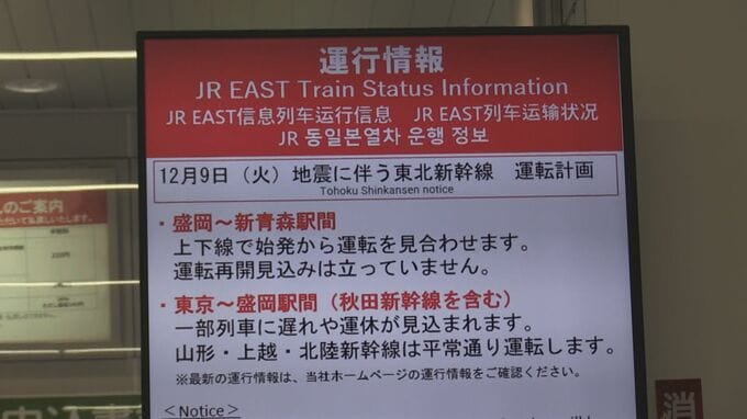 8日夜に発生した青森県東方沖を震源とする地震の影響で、東北新幹線は盛岡駅~新青森駅間の上下線で運転を見合わせていて、JR盛岡駅には駅員に運転再開のめどや代替交通機関について尋ねる人の姿が見られました。