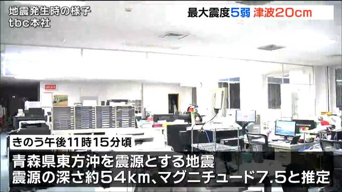 8日午後11時15分頃、青森県東方沖を震源とする地震がありました。震源の深さは約54㎞、地震の規模を示すマグニチュードは7.5と推定されます。