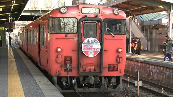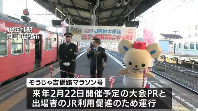 「そうじゃ吉備路マラソン号」出発式 2月22日開催の大会をPRするヘッドマーク【岡山】