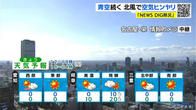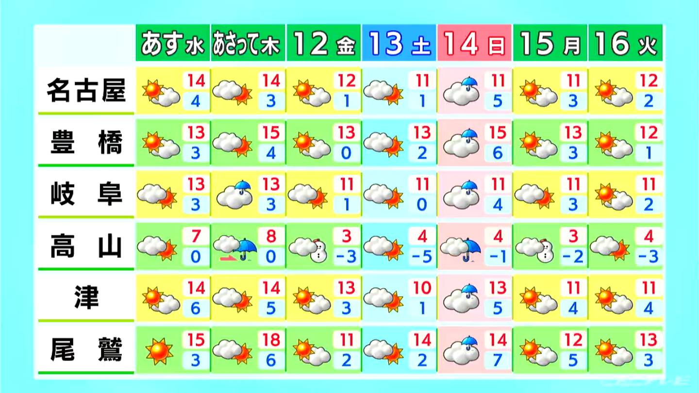 最高気温は名古屋や岐阜、津で13℃、高山で7℃の予想です。日差しは暖かいものの、北寄りの冷たい風で日中も空気がヒンヤリとするでしょう。